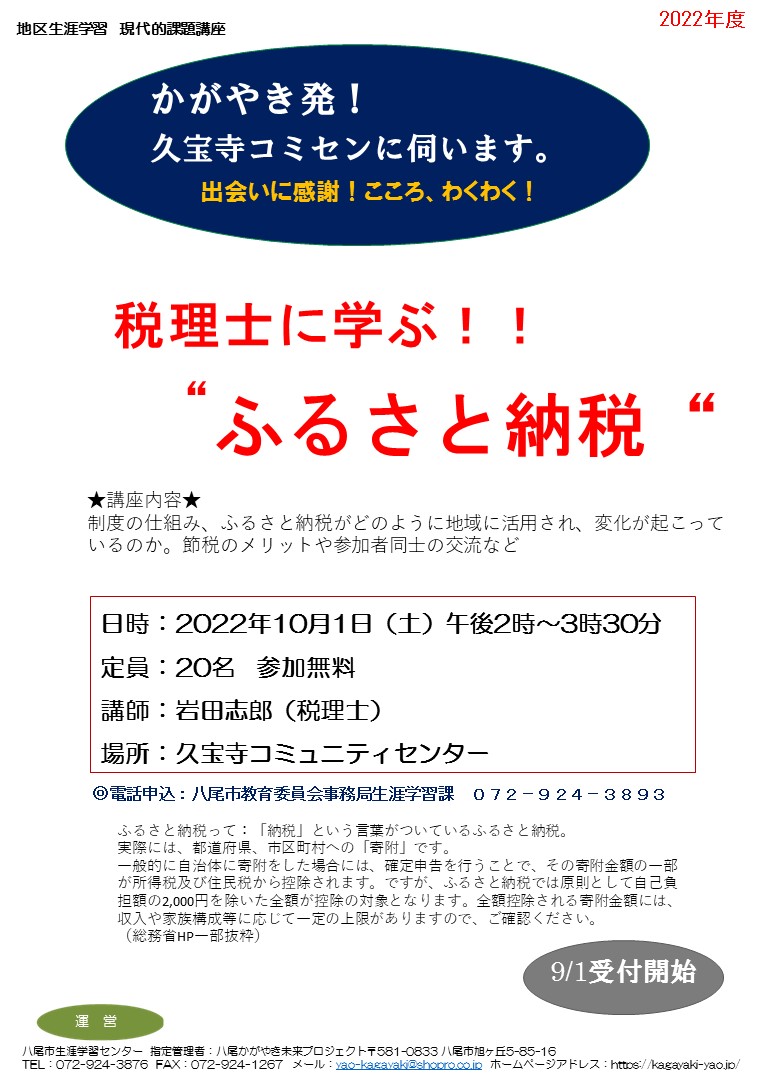 - 人気急上昇中の「ふるさと納税」の魅力をお話します。「ふるさと納税の手続き」「ふるさと納税はこんなにお得!」「よくある失敗談」「相続とふるさと納税」等です。ご期待ください。 2022年10月1日(土)午後2時~3時半 久宝寺コミュニティセンター 無料です。ご予約 072-924-3893(9月1日受付開始です)